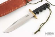 This Model 14 by Randall Made Knives features a satin finished blade with sharpened top edge, .228" blade stock. 1.363" blade depth, full tang construction. The handle has a brass guard, black linen micarta handle with a lanyard hole at the butt. This knife was designed to meet the demand for an almost indestructible all-purpose knife, though it is especially suited for combat and survival purposes. Comes with brown leather sheath and zipper case. Has some light scuffs, and some patina. Excellent condition otherwise.