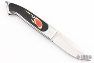 This Interframe Lockback by Charles Bennica features a mirror polished blade with false top edge. The handle has a mirror polished stainless steel frame with inlays consisting of black bakelite with natural coral and 24k gold inlays, mirror polished stainless steel backspacer and butt which is the lock release. Nice lockup and blade seating. Has some extremely minor hairling handling marks, otherwise excellent condition. Dated 2013