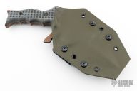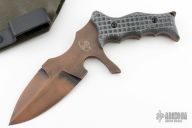 This UUK is a Laci Szabo design made by Robert Martin. It features a black/bronze coated double-edged blade, .292" blade thickness and 2.035" blade depth, full tang construction. The handle has blue denim micarta scales with frag pattern. The UUK, or Urban Utility Knife is the most well-known of Laci Szabo's designs. One mean field-tested tactical. Comes with kydex sheath with belt loops. New from maker.