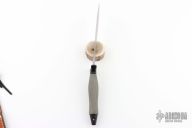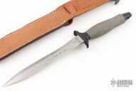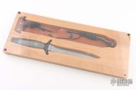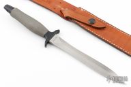 This 20th Anniversary Mark II #XX3625 has a satin finished L-6 tool steel double edged blade with hidden tang. Blade stock is .226", depth is .913", hidden tang construction. Handle is Grey "Cat's Tongue" textured aluminum with black double guard and black butt with lanyard hole. This model has a 5 degree cant on the blade so it rides closer to the body during carry. Comes with brown leather sheath and wooden display box. Plexi has a chip in one corner and one screw is missing, otherwise, Excellent condition.