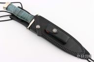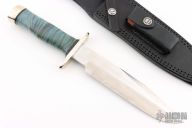 The Model 14CDT by Randall Made Knives features satin finished blade with sharpened top edge, .241" blade stock and 1.399" blade depth, hidden tang construction. The handle has a nickel silver guard and butt, stabilized and dyed Norwegian curly maple grip with black spacers. Comes with a black leather sheath. Excellent condition.