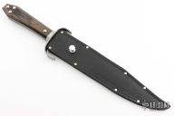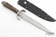 This is a discontinued Bill Bagwell designed Fortress Bowie, made by Ontario Knife, features a bead blasted blade with nearly sharpned top edge, .290" blade stock and 1.292" blade depth, hidden tang construction. The handle has a bead blasted stainless steel guard, wooden coffin handle with nameplate. Black leather sheath. Has a couple light scuffs, otherwise excellent condition.