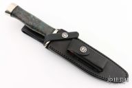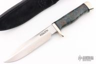 This Model 5 Camp and Trail Knife by Randall Made Knives features a satin finished blade with false top edge and notched thumbrest, .220" blade stock and 1.149" blade depth, hidden tang construction. The handle has a nickel silver guard and butt with rounded upper edge, a dyed and stabilized maple burl wood grip with black spacers. Comes with a black leather sheath with belt loop. Excellent condition.