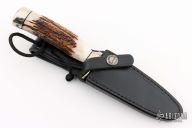 This Model 26 Pathfinder by Randall Made Knives is one of Randall's best selling models. It features a drop point satin finished blade with notched thumbrest, .184" blade stock and .972" blade depth, hidden tang construction. The handle has a nickel silver guard and butt, stag grip and black spacers. Comes with a black leather sheath. Excellent condition.