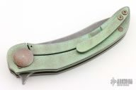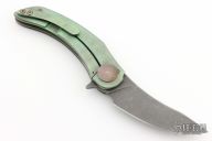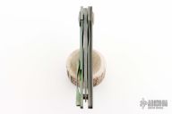 This Thuck Perversion by John Gray features a dark tumble finished blade with flipper. The handle has a carbon fiber and anodized and bark finished titanium frame with a matching tip up clip. Nice detent, lockup and blade seating. Rides on bearings. Has a couple light scuffs, otherwise excellent condition.