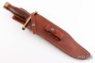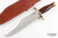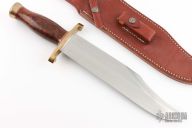 This Model 12-11 Smithsonian Bowie by Randall Made Knives features a satin finished carbon steel blade with sharpened top edge, .325" blade stock and 2.104" blade depth, hidden tang construction. The handle has a lugged brass guard, desert ironwood grip, red/brass spacers, and brass butt cap. Comes with a brown leather sheath and zipper case. Has some light scratches and some patina. Excellent condition otherwise.