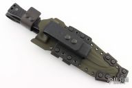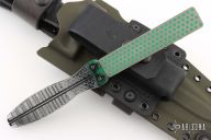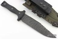 This Custom M-22 by Miller Bros Blades features a two-tone clip point blade with textured spine made from Z-Wear PM steel, .322" blade stock 1.984" blade depth, full tang construction. The handle has textured black G-10 scales, lanyard holes at the butt. Comes with a kydex/leather sheath and COA dated 2024. New condition.