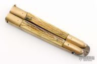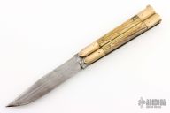 This balisong from the Philippines features a satin finished blade. The handle has brass bolsters and brass channel/liners, jigged bone scales. Has some scratches and patina, otherwise good condition.
