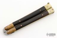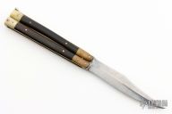 This balisong from the Philippines features a satin finished blade. The handle has brass bolsters and brass channel/liners, buffalo horn scales. Has some scratches and patina, otherwise good condition.