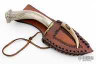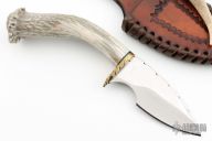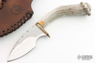 This knife features a mirror polished blade with a file-worked spine and large choil. .170" blade stock and 1.665" blade depth, hidden tang construction. The handle has a brass guard and a stag handle with a black spacer. Comes with a brown/black leather sheath. Has some light scuffs and scratches, great condition otherwise.