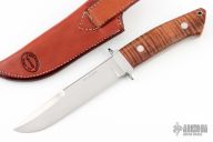 This Chute Knife by WE Ankrom has a hand rub satin finished blade with sharpened top edge, .150" blade stock and 1.045" blade depth, full tapered tang construction. Handle has a stainless guard, stabilized Curly Koa wood scales with red liners. Knife is in excellent condition. Included is a hand tooled brown leather belt sheath.