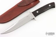 This Fighting knife by George Herron features a mirror polished blade with a 2 3/4" sharpened top edge, .182" blade stock and 1.073" blade depth, full tapered tang construction. The handle has a mirror polished stainless steel double guard and pins, desert ironwood scales with red liners. Stamped 1567 on the tang of the blade and the sheath is also marked 1567. Excellent condition. Comes with original brown leather sheath and a zippered case.