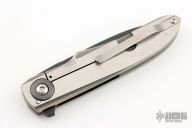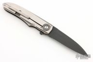 This Framelock flipper from Jason Clark features a black drop point blade. The handle has an orange peel finished titanium frame with zirconium pivot collars, a black stainless steel backspacer, tip up titanium clip. Blade is centered when closed, flips very well on IKBS and locks up with no play/movement. Comes with a felt pouch. Has a couple light scuffs, otherwise excellent condition.