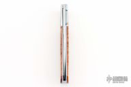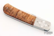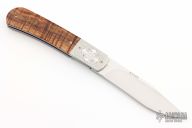This linerlock folder by Andre Thorburn features a hand rub satin finished blade with Dellana dots. The handle has stippled/engraved 304 stainless steel bolsters, stabilized ringed Gidgee scales, anodized titanium liners, stainless steel backspacer. Smooth action with a nice detent, lockup and blade seating. Comes with a cloth pouch. Excellent condition.