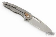 This Sigil MK6 by Microtech Knives features an Apocalyptic finished blade with partial serrations, thumb hole and flipper, notched thumbrest. The handle has an Apocalyptic finished titanium frame, tip up clip and backspacer with a distressed copper overtravel stop, stainless lockface insert. Comes with original box and papers. S/N0727, 04/2017. Has some patina, excellent condition otherwise.