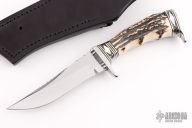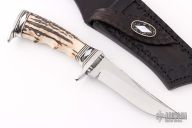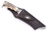 This Personal Fighter by Lloyd Hale features a mirror polished blade with false top edge and fileworked spine, .247" blade stock and 1.206" blade depth, hidden tang construction. The handle has a stainless steel guard and butt, finger groove stag grip, black/nickel silver spacers, and another spacer that looks like nickel silver chips in black resin with mother of pearl inlays. Comes with a hand tooled black leather sheath with matching spacer overlay. Excellent condition.