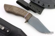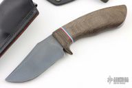 This Commander Elite by Dark Timber Knives features a dark tumble finished blade with a false top edge, .191" blade stock and 1.444" blade depth, hidden tang construction. The handle has a canvas micarta guard and grip with red/white/blue spacers. Comes with a Jou Foo brown leather sheath. Excellent condition. Comes with an additional kydex sheath with clips.