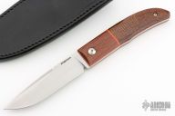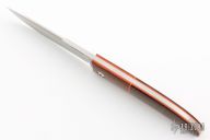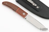 This Custom Fixed Blade by Enrique Pena features a hand rub satin finished blade with false top edge, .149" blade stock and .891" blade depth, full tang construction. The handle has micarta scales with white orange G10 spacer. Comes with a black leather sheath.  New from maker!