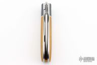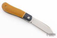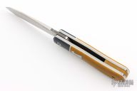 This Dogleg Front Flipper by Enrique Pena features a hand rub satin finished drop point blade with a notched thumbrest and front flipper. The handle has canvas micarta bolsters, natural canvas micarta scales over white liners, titanium liners, micarta backspacer.  Stainless steel shield. Includes padded zippered case. New from maker!