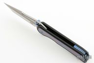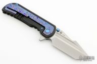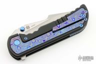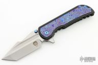 This Apocalypse Flipper by Mechforce is an Alphahunter design. It features a two-tone blade with fullers, dual thumbstuds and a flipper. The handle has a black titanium frame with black timascus inlays, titanium backspacer and a black timascus tip up clip. Rides on bearings, nice detent, lockup and blade seating. Comes with original case. New from maker!