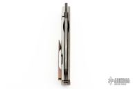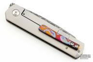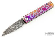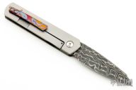 This Deville Front Flipper by Enrique Pena features a Chad Nichols Damascus blade with swedge, notched thumbrest and front flipper. The handle has a ZircuTi and bead blasted titanium frame with ZircuTi tip up clip. Nice detent, lockup and blade seating. Comes with zippered case. New from maker!
