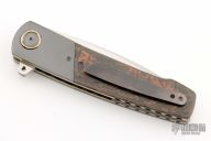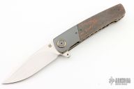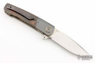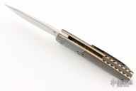 This HB07 linerlock flipper by Herucus Blomerus features a hand rub satin finished blade with polished flats and flipper. The handle has Zirconium bolsters with anodized titanium pivot collars, Snake Skin Fat Carbon scales, anodized titanium liners with fileworked spines, Snake Skin Fat Carbon backspacer and a tip up zirconium clip. Blade is centered when closed, nice detent and lockup. Very smooth flipping action, rides on IKBS. Comes with leather case and COA. New from maker at the 2024 Blade Show Texas.