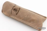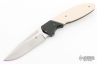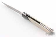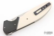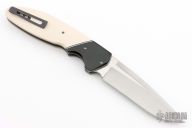 This Model 15 by Jason Clark features a stonewashed blade with satin flats, false top edge and a checkered flipper. The handle has dovetailed black paper micarta bolsters, ivory paper micarta scales with black/white spacers, blasted titanium liners, blackened titanium tip up pocket clip and a floating stainless steel backspacer. Includes a leather slip sheath with COA. New from maker at the 2024 Blade Show Texas.