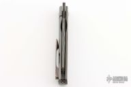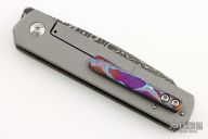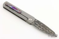 This Deville Front Flipper by Enrique Pena features a Chad Nichols Damascus blade with swedge, notched thumbrest and front flipper. The handle has a ZircuTi and bead blasted titanium frame with ZircuTi tip up clip. Nice detent, lockup and blade seating. Comes with zippered case. New from maker!
