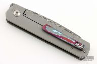 This Deville Front Flipper by Enrique Pena features a Chad Nichols Damascus blade with swedge, notched thumbrest and front flipper. The handle has a ZircuTi and bead blasted titanium frame with ZircuTi tip up clip. Nice detent, lockup and blade seating. Comes with zippered case. New from maker!