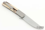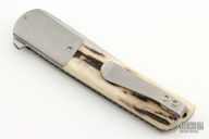 This Linerlock flipper from Brad Zinker features a stonewashed blade with checkered thumbrest and flipper. The handle has a stonewashed and dovetailed titanium bolsters, sambar stag scales, titanium liners with laser engraved interiors, stonewashed titanium tip up clip. Nice detent, lockup and blade seating, rides on bearings. Includes a padded zippered case. New from maker at the 2024 Blade Show Texas.