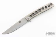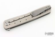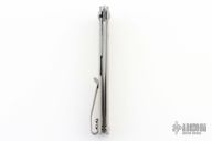 This Framelock flipper from Brad Zinker features a stonewashed Magnacut blade with checkered thumbrest and flipper. The handle has a satin finished titanium frame with stonewashed titanium tip up clip, titanium hardware. Nice detent, lockup and blade seating, rides on bearings. Includes a padded zippered case. New from maker at the 2024 Blade Show Texas.