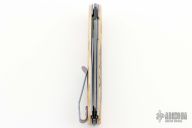 This Bartlow Skinner flipper from Brad Zinker features a Vegas Forge Virus Damascus blade with checkered thumbrest and flipper. The handle has mammoth ivory scales, anodized titanium liners laser engraved interiors, anodized tip up clip, floating matching Damascus backspacer. Nice detent, lockup and blade seating, rides on bearings. Includes a padded zippered case. New from maker at the 2024 Blade Show Texas.