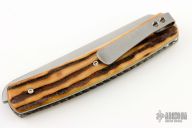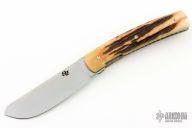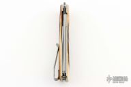 This Bartlow Skinner front flipper from Brad Zinker features a stonewashed blade with checkered thumbrest and flipper. The handle has stag scales, titanium liners laser engraved interiors, stonewashed tip up clip. Nice detent, lockup and blade seating, rides on bearings. Includes a padded zippered case. New from maker at the 2024 Blade Show Texas.