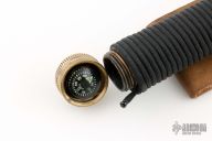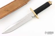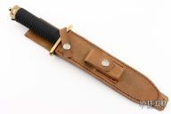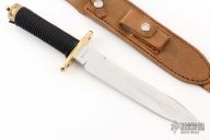 This survival knife by Steve Voorhis features a mirror polished blade with sawteeth on the top edge, brass fittings, and a hollow cord wrapped handle, .242" blade thickness and 1.413" blade depth. Butt cap unscrews and has a compass. Comes with a brown leather sheath. Great feel in the hand. Excellent condition. #12418