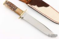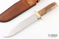 This Bowie by Fred George Millard features a hand rub satin finished blade with false top edge, .182" blade stock and 1.514" blade depth, hidden tang construction. The handle has a brass guard and butt with a stag and bone grip. Blade is stamped #00165 and dated 1995. Comes with a brown leather sheath with hair hide overlay. Has some light scratches on the blade, otherwise excellent condition.