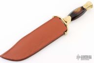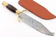 This bowie features a clip point blade with false top edge, .240" blade stock and 1.770" blade depth, hidden tang construction. The handle has a brass guard, brass dovetailed butt and collar with a rosewood grip. Comes with a brown leather sheath. Has some scratches and patina, otherwise good condition. Consigner said he bought this in 1971.