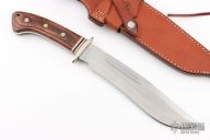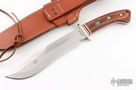 This Grizzly Bowie by Tak Blades features a satin finished, recurved bowie style blade with swedge and fullers, .257" blade stock and 1.772" blade depth, hidden/frame tang construction. The handle has a nickel silver guard with nickel silver and red and black fiber spacers, dymondwood scales with Grizzly Paw shield and nickel silver pins over full tang construction. Brass lanyard tube in pommel. Includes leather sheath with belt loop. Has a couple light scratches, otherwise excellent condition.