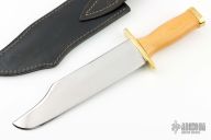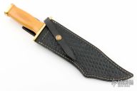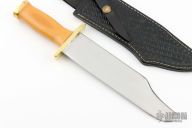 This bowie by Art Wiman features a clip point blade with false top edge, .232" blade stock and 1.983" blade depth, hidden tang construction. The handle has a brass guard and butt with a yellow paper micarta grip. Comes with a hand tooled black leather sheath. Has some scratches and patina, otherwise good condition.