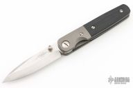 This Custom MV-2 by Emerson Knives features a chisel ground blade with knurled thumbstud and a swedge. The handle has bead blasted and dovetailed titanium bolsters, black G-10 scales and backspacer, bead blasted titanium liners. Nice detent, lockup and blade seating. Has scuffs, otherwise excellent condition. Comes with an Emerson box and paperwork (not original to the knife).