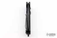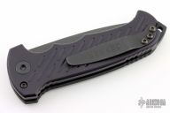 This 06 Side Opening Auto has a matte black finished S30V tanto partially serrated blade. Handle is black aluminum over black stainless steel liners, exposed stainless steel tang butt/ glass breaker/ backspacer with lanyard hole, black stainless steel tip up (RH/LH reversible) clip, and safety button. Has some light scuffs, otherwise excellent condition. Comes with original box and sheath.