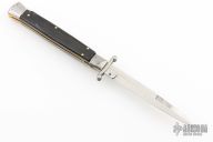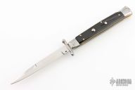 This 11" Swing Guard Auto by Frank Beltrame features a bayonet ground blade with false top edge. The handle has stainless steel bolsters, front and rear, buffalo horn scales, brass liners, stainless spring. Excellent condition.