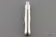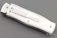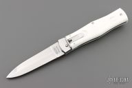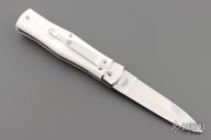 This Leverlock Auto by Mikov Knives features a polished spear point blade with false top edge. The handle is comprised of steel bolsters, lever and pins with white plastic scales over steel liners and backspacer. Strong leaf spring action. New condition. Comes with original box and papers.