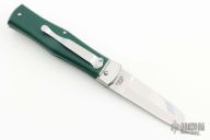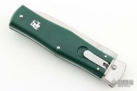 This Leverlock Auto by Mikov Knives features a polished spear point blade with false top edge. The handle is comprised of steel bolsters, lever and pins with green plastic scales over steel liners and backspacer. Strong leaf spring action. New condition. Comes with original box and papers.