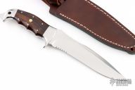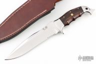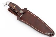 This RAT-K Counter-Terror Knife from Forge Master K. Ali is a Modell Design LLC. It features a high satin finished partially serrated blade with sharpened top edge and notched thumbrest, .194" blade stock and 1.573" blade depth, full tapered tang construction. The handle features 304 stainless steel dovetailed bolsters and pommel, Arizona Desert Ironwood scales with red and blacl liners, stainless steel and mosaic pins, lanyard hole at the butt. New from maker. Includes brown leather sheath and original box. New from maker.