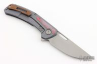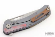 This Archer by Tactile Knife features a stonewashed blade with thumbhole and notched flipper. The handle has a feathered pattern anodized titanium frame with pink copper inlays, anodized titanium backspacer and tip up clip. Rides on bearings, nice detent, lockup and blade seating. Comes with original zippered case and COA dated 2/21/24. New from maker at the 2024 Blade Show.