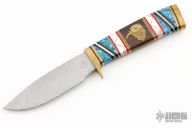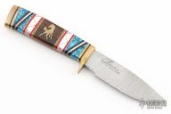 Beautiful fixed blade customized by David Yellowhorse. "Knapped" blade with brass guard and pommel. Brass "Cuthair Yellowhorse" inlay in ironwood. Spacers of turquoise, brass, black, pearl and red. Comes in original wooden display box with engraved plaque and original papers. Excellent condition. S/N 0303