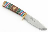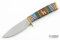 Beautiful fixed blade customized by David Yellowhorse. "Knapped" blade with brass guard and pommel. Brass "Cuthair Yellowhorse" inlay in ironwood. Spacers of turquoise, brass, black, pearl and red. Comes in original wooden display box with engraved plaque and original papers. Excellent condition. S/N 0303