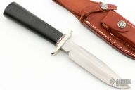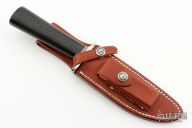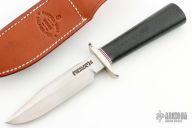 The Model 1-5 by Randall Made Knives has a nickel silver guard, black linen micarta grip with red/white/blue spacers. Satin finished blade with sharpened top edge, .226" blade stock and 1.103" blade depth, hidden tang construction. Comes with a brown leather sheath. Has a few scratches on the blade, otherwise excellent condition.