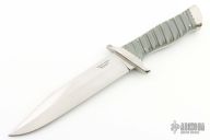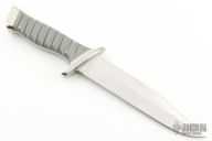 This knife by Bob Sky features a satin finished clip point blade with sharpened top edge, .210" blade stock and 1.331" blade depth, full tapered tang construction. The handle has nickel silver guard and butt, fluted grey paper micarta scales, fileworked nickle silver liners and pins. Excellent condition.