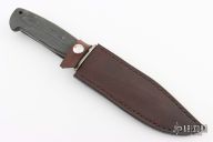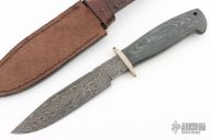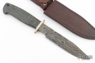 This fighter by William Miller features a clip point Damascus blade with false top edge and fileworked spine, .239" blade stock and 1.255" blade depth, hidden tang construction. The handle has a nickel silver guard, black canvas micarta grip with single stainless pin and a lanyard hole. Comes with a brown leather sheath. Excellent condition.